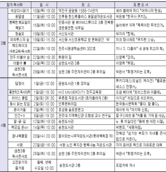 전북환경운동연합이 진행하는 초록 강좌 수강생들의 모임 행복한 화요일의 책 읽어(대표 허정화)에서는 인문·사회 학습 동아리에 가깝고, 파피루스의 숲(대표 서병철)은 책도 좋아하지만 산을 좋아하는 동아리 성격이 강하다. 독서 지도사와 독서토론 코칭 수강생이 주축을 이루는 청솔모(대표 차미영)와 말·글·길(대표 김순희)를 비롯해 작가 혹은 전문가와 만남이 주선되는 홈엔히즈 독서대학(대표 오정화), 헤드페이크독서회(대표 백용식), 전주 서원노인복지회관의 어르신 모임 서원(대표 이종기), '시대의 스승' 신영복 선생의 책을 중심으로 한 전주 더불어 숲(대표 김성숙)도 인기다.