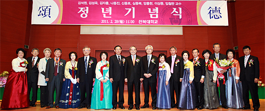 전북대학교(총장 서거석)가 대학 발전과 후진양성을 위해 평생을 교단에서 보내고 올 2월말로 정년을 맞는 교원들에 대한 정년기념식을 지난달 28일 법학전문대학원 본관 가인홀에서 거행했다.