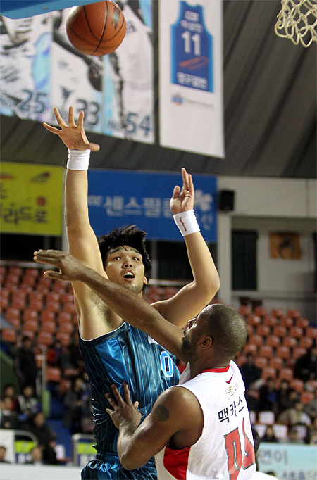9일 전주 실내체육관에서 열린 프로농구 전주 KCC와 대구 오리온스의 경기에서 KCC 하승진이 원핸드슛하고 있다.