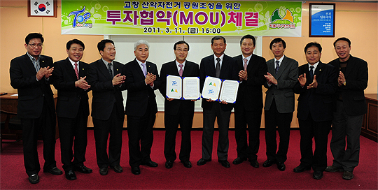 이강수 군수와 이종균 이사장은 이달 11일 군청 상황실에서 고창 산악자전거공원 조성 투자협약을 체결, 전 세계 수백만명의 자전거 애호가들이 찾는 산악자전거 공원 조성에 나섰다.