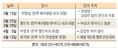 전북일보사와 홈 상담교육센터가 '2080 여성, 행복을 디자인하다'를 주제로 한 건강 특강을 마련합니다. 상반기와 하반기로 나뉘어 열리는 이번 무료 특강에는 류마티스, 유방암.갑상선암 진단과 치료, 치아 관리에 이르기까지 다양한 강좌가 준비됩니다.