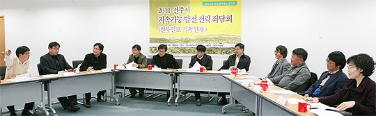 전주 지속가능발전 전략 좌담회(생태·환경 분과)가 지난 18일 전주시청 별관 회의실에서 열렸다. 사진 왼쪽부터 김하생·선성진·엄성복·박창호·박종영·박비오·최현규·변무섭·박정원·이정현·김임순씨. 추성수(chss78@jjan.kr)