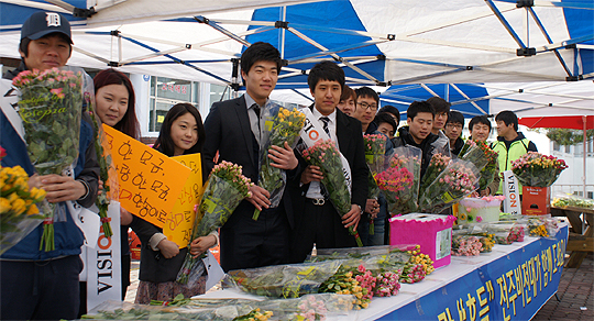 전주비전대학 총학생회 임원들과 교직원들은 22일 우정관 앞에서 일본 지진으로 수출에 어려움을 겪고 있는 장미 생산농가들의 시름을 덜어주기 위해 장미 300박스 판매 행사를 가졌다.