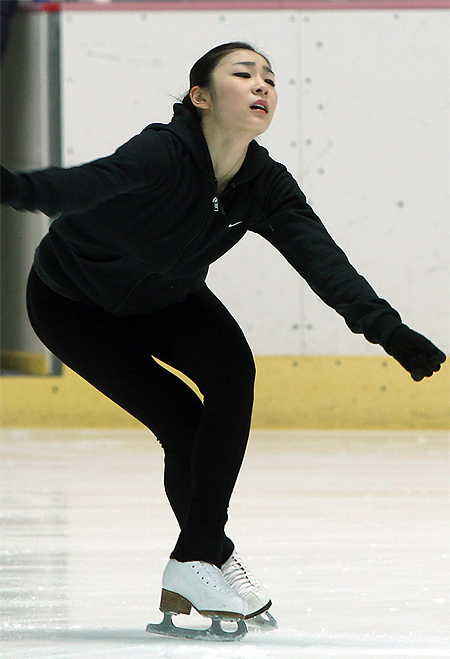 점퍼와 체크무늬 목도리를 벗어 놓고 가벼운 활주를 시작한 김연아는 몇 차례 부드러운 스핀을 보여주며 동작을 가다듬었다.