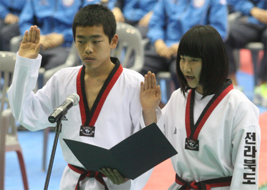 2011년 전국 종별(중등부) 태권도선수권 대회가 28일 남원춘향골체육관에서 열린 가운데 개회식에서 이관우(전북체육중)군과 김세진(양지중)양이 선서를 하고 있는 모습 (desk@jjan.kr)