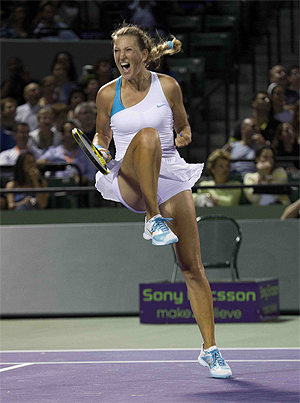 27일 미국 플로리다주 키 비스케인에서 열린 소니 에릭슨 테니스 대회에서 벨라루스의 빅토리아 아지렌카가 슬로바키아의 도미니카 시불코바를 꺾은 뒤 자축하고 있다.