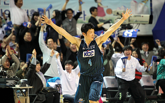 28일 전주 실내체육관에서 열린 프로농구 6강 플레이오프 전주 KCC와 서울 삼성의 2차전, KCC추승균이 2차 연장전에서 결정적인 3점슛을 성공한 뒤 환호하고 있다.