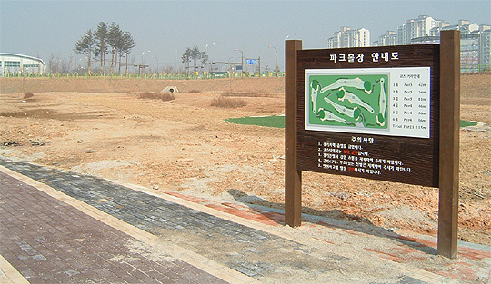 하지만 최근 공사를 마무리한 공원 한 중앙에 전체 면적의 6분의1 가량을 차지하는 규모 9860㎡의 6홀 미니골프장이 조성됐다. 더욱이 미니골프장은 각 홀마다 30m~80m 정도의 다양한 거리를 갖추고 있는데다, 준공된 지난해 11월부터는 미니골프장 입구에 골프 게임에 참여하지 않는 일반인들의 출입을 통제하는 안내판까지 버젓이 설치돼 공원을 찾은 시민들의 비난은 더욱 거세지고 있다.