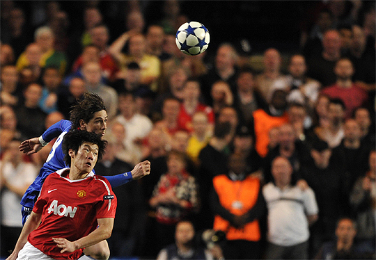 멘체스터 유나이트드의 박지성(오른쪽)이 6일 영국 런선 스탬퍼드 브리지 경기장에서 열린 2010~2011 챔피언스리그 8강 1차전 첼시와의 원정경기에서 첼시의 페르난도 토레스(왼쪽)와 공중 볼다툼을 벌이고 있다.