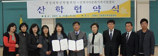김제 벽성대학 산학협력단과 김제시 다문화가족지원센터는 11일 산·학 협약식을 체결하고, 결혼이민자의 안정적인 한국사회 적응 및 정착을 위해 상호 노력하기로 했다.
