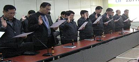 LH 전북지역본부(본부장 윤여공)는 12일 건설현장에서의 근본적인 부조리 척결을 위해 '부패추방 및 청렴실천 결의대회'를 가졌다. 전북본부는 이에 앞서 '건설현장 Clean Society'를 구성했다.