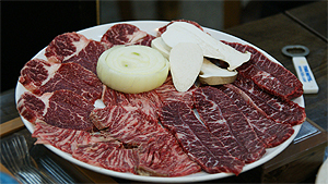 △ 메뉴: 소고기모듬 600g 3만 원, 특수부위 600g 5만 원, 육회 400g 3만 원, 한우육회비빔밥 7000원, 한우불고기쌈밥 7000원, 비빔채 2000원, 공깃밥 1000원