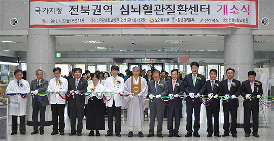 원광대병원(병원장 정은택)은 23일 대강당에서 원광학원 이성택 이사장, 원광대 정세현 총장, 이한수 익산시장, 국회 이춘석 의원, 시의회 박종대 의장, 보건복지부 전병율 공공보건정책관, 도의회 김성주 환경복지위원장, 전북도의사협회 방인석 회장 등 250여명이 참석한 가운데 전북권역 심뇌혈관질환센터 개소식을 가졌다.