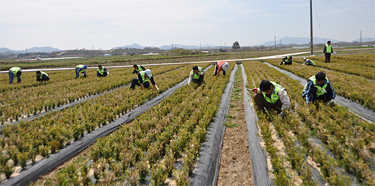 오전에는 약 2400평에 회양목을 심은 밭에 잡초를 뽑고, 오후에는 마을 주변청소 및 보수를 실시했다.