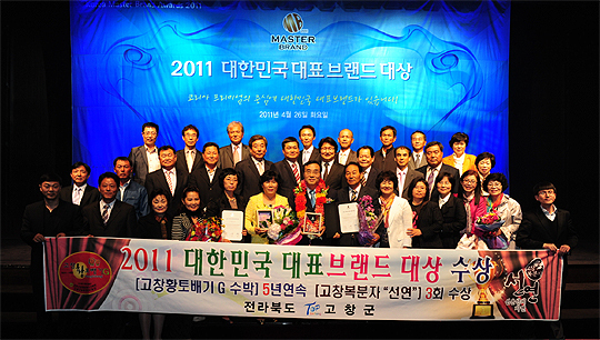 '고창황토배기 G수박'과 '고창복분자 선연'이 동아닷컴, iMBC, 한경닷컴이 주관하고 동아일보, 한국경제신문이 후원한 2011 대한민국 대표브랜드 대상에 선정됐다. 이번 수상으로 고창황토배기 G수박은 5년 연속 대상을, 고창복분자 선연은 3회째 수상의 영예를 안았다.