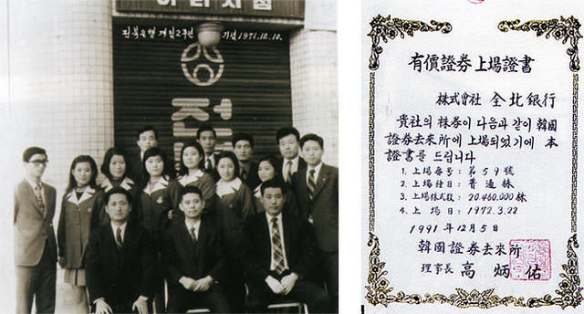 (좌)1970년 12월 27일 도내 최초 음단위 김제지점 신설, 유가증권 상장증서. (desk@jjan.kr)