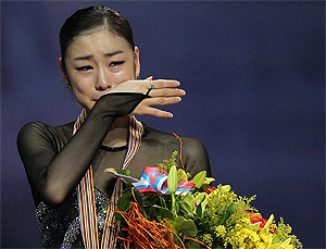 모스크바 세계선수권대회에 출전한 피겨여왕 김연아가 30일 러시아 모스크바 메가스포츠 아레나에서 열린 시상식에서 아깝게 은메달을 목에 건 후 눈물을 흘리고 있다.