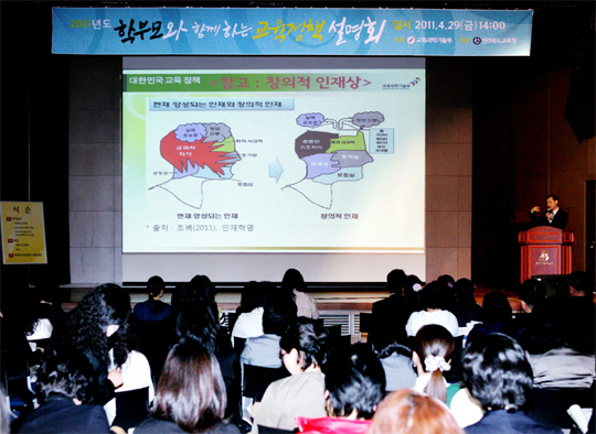 다변화되고 있는 입시제도에 탄력적으로 대응하고 학부모들의 능동적 학교 참여 촉진을 위한 학부모 대상 교육정책 설명회가 김승환 교육감과 이상진 교과부 인재정책실장, 학부모 학교 참여 지원대상학교 학부모 대표, 학교운영위원 등 400여명이 참석한 가운데 지난 29일 오후 도교육청에서 열렸다.