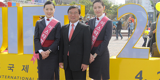 이스타항공 객실승무원들과 함께 영화의 거리에서 전주국제영화제를 홍보하고 있는 이상직 이스타항공그룹 회장 (desk@jjan.kr)