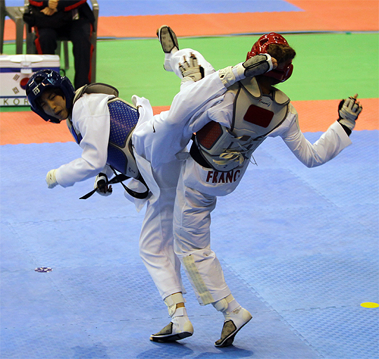 2일 경북 경주 실내체육관에서 열린 세계태권도선수권대회 이틀째 여자-53kg 경기에서 한국의 이혜영(청) 선수가 프랑스의 Coutant 선수를 공격하고 있다.