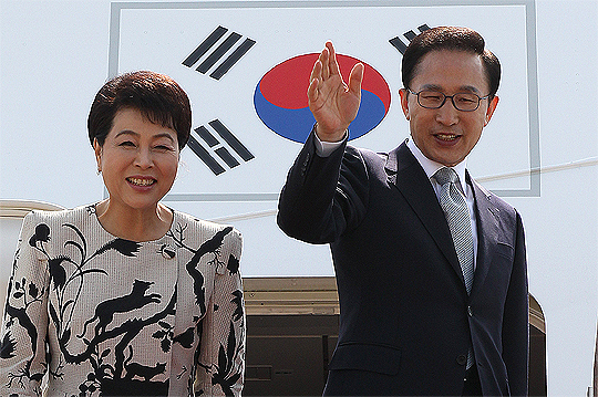 독일과 덴마크, 프랑스를 방문하는 이명박 대통령과 부인 김윤옥 여사가 8일 오전 서울공항에서 전용기에 탑승하며 손을 들어 인사하고 있다