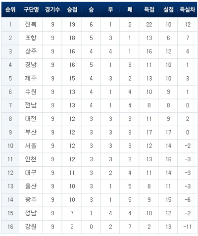 전국 16개 구단중 1위에 오른 전북은 9경기를 치른 현재 6승1무2패로 승점 19점이다.