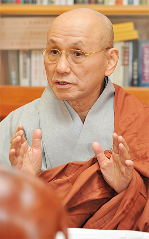 큰 스님은 말미에 부처님 오신 날을 맞아 평소 마음에 새기는 경구를 선물로 내놓았다. '귀일심원 요익중생(歸一心源 饒益衆生)'. 큰 스님의 방에도 걸려 있는 이 경구는 '한마음의 근원으로 돌아가 중생에게 이익이 되게 해야 한다'는 뜻이 담겼다. 우리 스스로가 마음 비우는 법을 배워 지혜를 얻고, 자비를 베푸는 삶을 살아야 한다는 가르침이다.