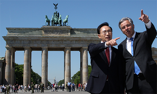 이명박 대통령이 클라우스 보베라이트 베를린 시장의 영접을 받아 9일 오전(현지시간) 베를린 시내 브란덴부르크 문을 방문하고 있다. 이 대통령은 과거 베를린 장벽의 중앙에 위치해 동ㆍ서독 분단의 상징이었던 브란덴부르크 문 앞에서 "그토록 두터웠던 베를린 장벽이 무너진 역사적 현장에 와보니 대한민국의 소원인 통일의 숨결이 느껴진다"고 말했다.