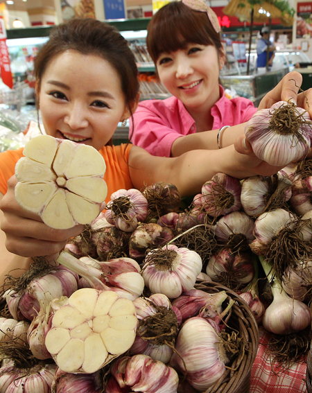 10일 서울 중구 봉래동 롯데마트 서울역점이 마늘 대표산지인 경남 창녕, 전남 고흥에서 올 해 첫 수확한 햇 주대마늘(줄기가 붙어있는 마늘)을 선보이고 있다. 오는 12일부터 19일까지 햇 마늘(반접.50통) 1만원에 판매한다.