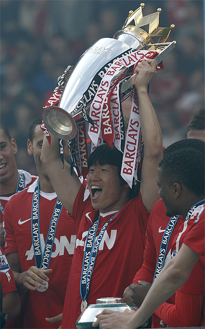 맨체스터 유나이티드의 박지성이 22일(현지 시간) 영국 맨체스터의 올드 트래포드에서 열린 잉글랜드 프리미어리그 블랙풀 FC 와의 경기가 끝난 뒤 리그 우승 트로피를 들고 기뻐하고 있다. (desk@jjan.kr)