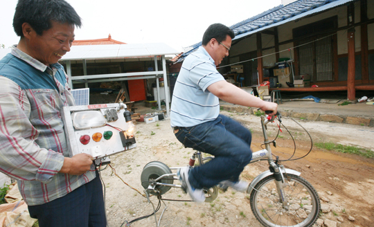 부안군 주산면 화정마을 한 농가에서 본보 강정원기자가 자전거를 이용하여 전기를 생산하는 체험을 하고 있다. 추성수(chss78@jjan.kr)
