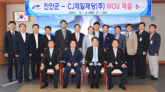 진안군과 CJ제일제당(주)은 2일 오전 11시 군청 상황실에서 농·축협장과 관련기관 및 공무원 20여명이 참석한 가운데 상호 업무협약을 체결했다.