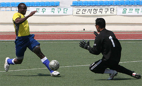 5일 군산월명종합경기장에서 열린 직장부 준결승전에서 미공군부대(울프팩팀) 선수가 군산경찰서 골키퍼와 일대일 상황에서 슛을 날리고 있다. 울프팩 팀이 2대1로 역전승을 거두고 결승전에 진출했다. 오균진(moscow14@daum.net)