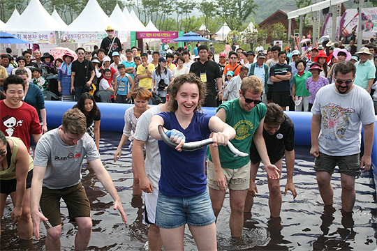 지난해 열린 '고창복분자 Food 페스티벌'에서 '장어일병 구하기'프로그램에 참가한 한 외국인이 장어를 잡고 즐거워하는 모습이다. (desk@jjan.kr)