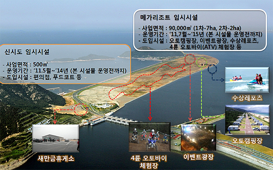 새만금 메가리조트 사업자로 선정된 JY중공업이 야미도에서 신시도로 이어지는 방조제 안쪽 다기능부지 9만㎡에 캠핑장과 해양레포츠시설을 갖출 예정이다.