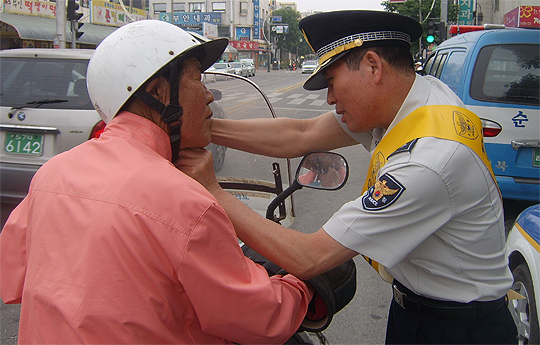 사진 있음=15일 부안읍 터미널사거리에서 문재익 경비교통과장이 오토바이 운전자를 대상으로 올바른 안전모 착용법을 설명하고 있다.