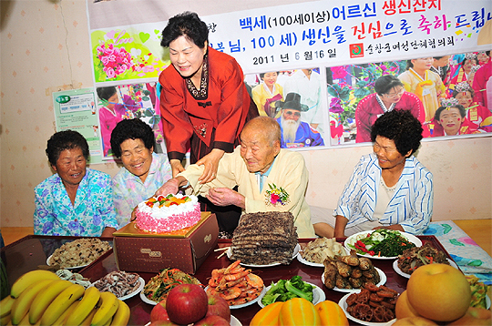 순창군이 100세가 되는 노인들에게 상차림을 통해 장수고장의 위상을 높이고 있다.