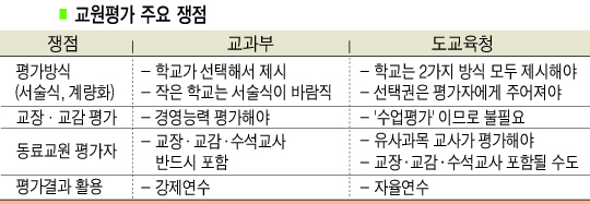 교과부와 도교육청은 현재 교원평가와 관련해 △교장·교감의 평가대상 포함여부 △자유서술식과 체크리스트 평가방식 △동료교원 평가에 교장·교감·수석교사 포함여부 △평가결과에 따른 강제연수 등 크게 4가지 사항에 대해 이의를 보이고 있다.