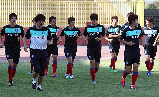 런던올림픽에서 아시아지역 2차 예선 2차전 원정경기를 위해 암만에 도착한 올림픽축구 대표팀 선수들이 21일 오후(현지시간) 암만에서 1시간 떨어진 자르카시 프린스 모하메드 경기장에서 열린 훈련에서 밝은 표정으로 연습을 하고 있다. (desk@jjan.kr)