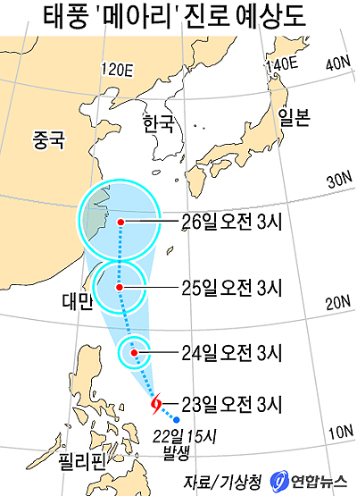 '메아리(Meari)'는 필리핀 마닐라 부근 해상에서 발생, 북서진하다가 25일께 동중국해상에서 빠른 속도로 북동진할 것으로 예상됐다. '메아리'는 중심 부근에서 강한 바람과 함께 많은 비를 동반하고 있다.