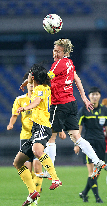 27일 오후 고양종합운동장에서 열린 IBK기업은행 2011 WK리그 인천 현대제철과 충북 스포츠토토 경기에서 성현아(오른쪽)와 스포츠토토 편해정이 공중볼 다툼을 벌이고 있다.