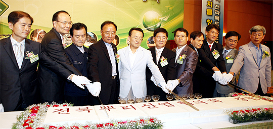 28일 전주 코아리베라호텔에서 열린 전북뿌리산업협의회 창립총회에서 김완주 도지사와 도내 뿌리기업 대표들이 축하 떡을 자르고 있다. 추성수(chss78@jjan.kr)