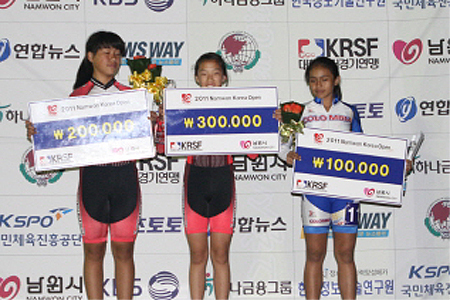 '2011 남원 코리아 오픈 국제 롤러 경기대회' 여초부 MVP를 차지한 남원월락초 양도이(6학년·가운데)와 개인종합 2위에 오른 같은 학교 변희송(6학년·왼쪽). (desk@jjan.kr)