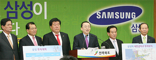 지난해 태양전지와 자동차용전지 LED 바이오제약 의료기기 등 5대 신산업을 공개하며 친환경산업을 선도하겠다고 발표한 삼성. 새만금 그린에너지산업단지 조성은 신산업 중 친환경에너지산업분야 비전을 구체화하는 내용을 담고 있다.