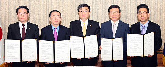 새만금 투자협약 양해각서 체결식. 좌측부터 농식품부 1차관, 김완주 도지사, 임채민 국무총리실장, 김순택 삼성그룹 미래전략실장 겸 신사업추진단장(부회장), 지경부 에너지자원실장. (desk@jjan.kr)