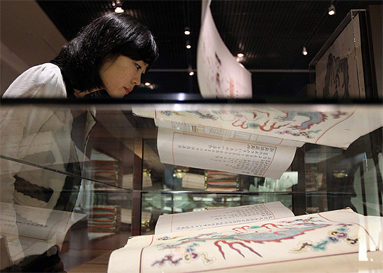 '145년 만의 귀환, 외규장각 의궤' 특별전 국립중앙박물관이 오는 19일부터 다음달 18일까지 특별전시실에서 특별전 '145년 만의 귀환, 외규장각 의궤'를 개최한다. 18일 한 국립중앙박물관 관계자가 숙종의 능인 명릉의 조성 절차를 기록한 '숙종산릉도감의궤'를 보고 있다.