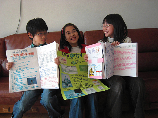 엄마와 함께 만든 가족신문을 들어 보이며 환하게 웃고 있는 학생들. (desk@jjan.kr)