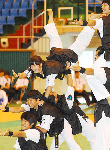 서울 관악고 김정영(3품)·송철준(3품)·김선웅(4품·이상 1학년)·신성철(4품·2학년)이 맨발로 평원 품새를 연습한다. 옆차기하는 넷의 발바닥이 하나같이 시커멓다. 이들은 다음날(24일) 열리는 고등부 단체 품새 부문에 참가한다고 했다. '제9회 우석대학교 총장기 전국 태권도 품새대회' 이틀째. 경기가 열리는 체육관 안만큼 밖의 열기도 뜨거웠다.