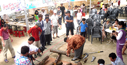 제4회 순창 도라지축제가 23일부터 이틀간 열린 가운데 관광객들이 통나무 자리기 체험을 하고 있다. (desk@jjan.kr)