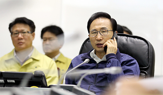 이명박 대통령이 27일 오후 정부중앙청사 중앙재난안전대책본부를 방문해 폭우 상황과 수방대책을 점검하고 있다.